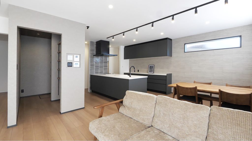 シックで落ち着いたトーンで統一された室内は、まさに「休日をゆったり過ごす」ための空間。壁の色に合わせて窓枠の色を変えるといった細部にまで及ぶこだわりが、空間全体の調和と高級感を生み出しています。