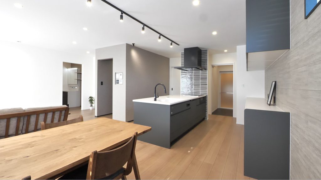 キッチンの横は壁ではなく、畳一枚分の通路が確保され、ぐるりと回遊できる設計に。料理をしながら洗濯室へ移動したり、お子さんがお風呂へ向かったりと、家族の動線が交錯せずスムーズです。
