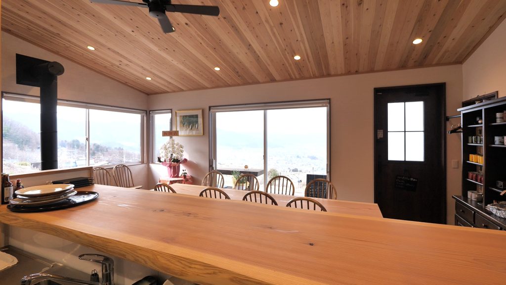 また、オーナー様自身が料理をしながら絶景を堪能できるキッチンからの眺めは、まさに特等席!トイレの手洗いカウンターにも杉の一枚板を使用するなど、細部に至るまで自然素材へのこだわりが貫かれています。