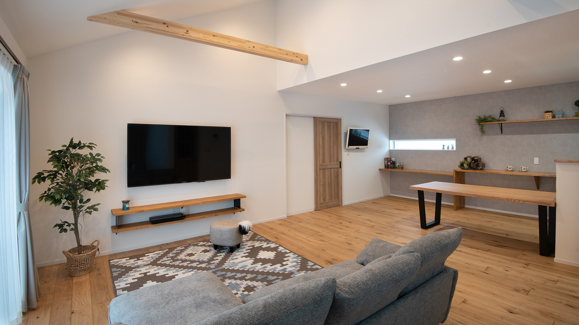 お客様の要望は「冬暖かく、夏涼しい家」。このコンセプトに基づき、設計は住宅性能を最重視しました。日当たりの悪い北側には窓を少なくするなどの工夫で気密性を高め、一年を通して快適な室内環境を実現。全室完備の床暖房は「じんわり温かい」と好評で、冬でもTシャツ一枚で過ごせるほど。エアコン1台で夏も快適に過ごせるのは、高い住宅性能の証です。