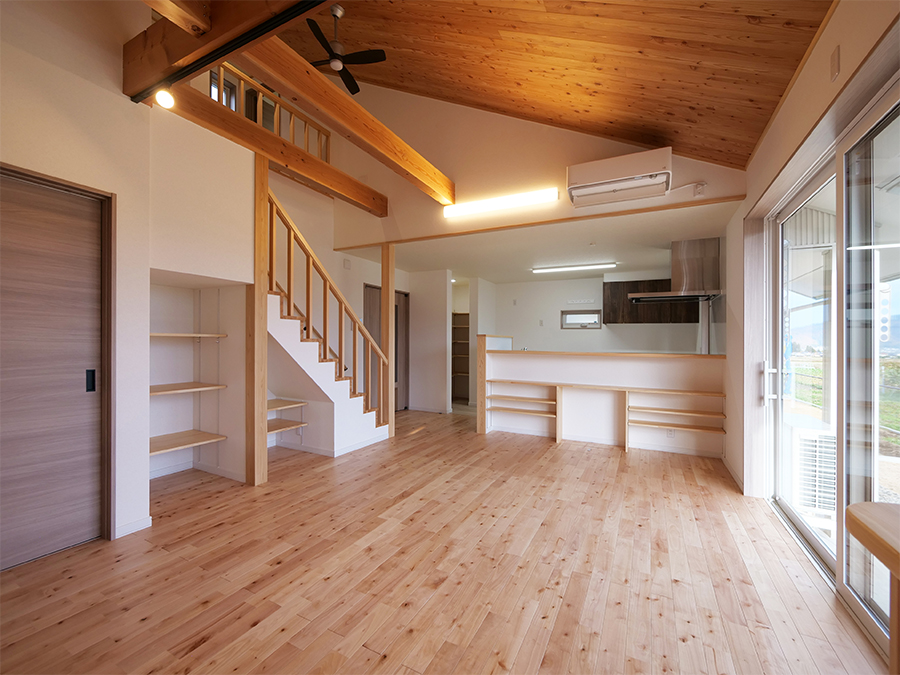 今回は、松澤工務店の設計士・丸田さんが登場です!3つのポイントは『健康な暮らしへのこだわりから自然素材を使用』『通気断熱WB工法』『花火が見られる絶景ポイント』。吹き抜けがもたらす空間の広がりが、28坪以上の解放感を実現しました。